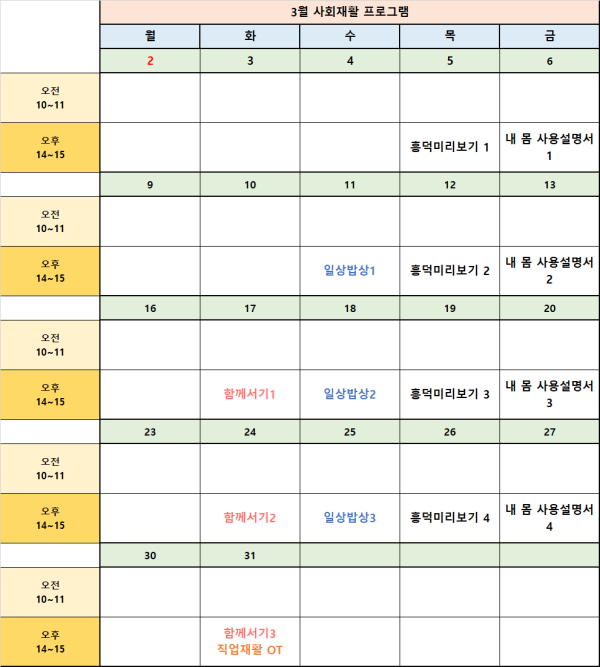 26년 3월 사회재활프로그램 시간표 게시글 작성정보 작성자 관리자 작성일 26-03-17 14:29 조회수 4 댓글수 0 목록 게시글 본문 3월 사회재활프로그램 시간표입니다 첨부파일 1개 KakaoTalk_20260317_141606984.png (42.0K) 0회 다운로드 첨부일시 : 2026-03-17 14:30:46 다음글 자살예방교육 사칭 피해 주의 26-03-12 댓글 0 등록된 댓글이 없습니다. 목록